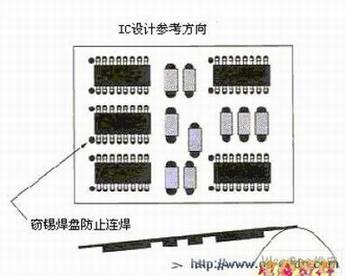 PCB上元器件的布局对生产效率和成本有相当重要的影响,是衡量PCB设计的可装联性的重要指标。一般来讲,元器件尽可能均匀地、有规则地、整齐排列,并按相同方向、极性分布排列。有规则的排列方便检查,有利于提高贴片/ 插件 速度,均匀分布利于散热和焊接工艺的优化。另一方面,为简化工艺流程,PCB设计者始终都要清楚,在PCB的任一面,只能采用 回流焊 接和波峰焊接中的一种群焊工艺。这点在组装密度较大、PCB的焊接面必须分布较多贴片元器件时,尤其值得注意。设计者要考虑对焊接面上的贴装元件使用何种群焊工艺,最为优选的是使用贴片固化后的波峰焊工艺,可以同时对元件面上的穿孔器件的引脚进行焊接;但波峰焊接 贴片元件 有相对严格的约束,只能焊接 0603 及以上尺寸的片式阻容﹑SOT﹑ (引脚间距≥1mm且高度小于2.0mm)。分布在焊接面的元器件,引脚的方向宜垂直于波峰焊接时PCB的传送方向,以保证元器件两边的焊端或引线同时被浸焊,相邻元件间的排列次序和间距也应满足波峰焊接的要求以避免“遮蔽效应”,如图1。当采用波峰焊接C等多脚元件时,应于锡流方向最后两个(每边各1)焊脚处设置窃锡焊盘,防止连焊。