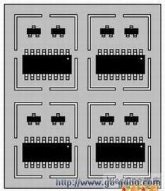 在对外形尺寸较小或外形不规则的PCB进行装联时,会受到很多限制,所以一般采用拼板的方式来使几个小的PCB拼接成合适尺寸的PCB进行装联,如图5。一般单边尺寸小于150mm的PCB,都可以考虑采用拼板方式,通过两拼﹑三拼﹑四拼等,将大PCB的尺寸拼至合适的加工范围,通常宽150mm~250mm,长250mm~350mm的PCB是自动化装联中比较合适的尺寸。