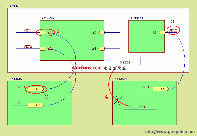 上图LAYER1中的A1点的网络名称虽然和LAYER2A中的A2点相同,但是由于是处于不同图页中,且没有页间连接符连接,所以它们之间没有联系。但是在实际设计时最好不要这样命名,以免出现混乱。应该按照右边的蓝色线条表示的方式命名。