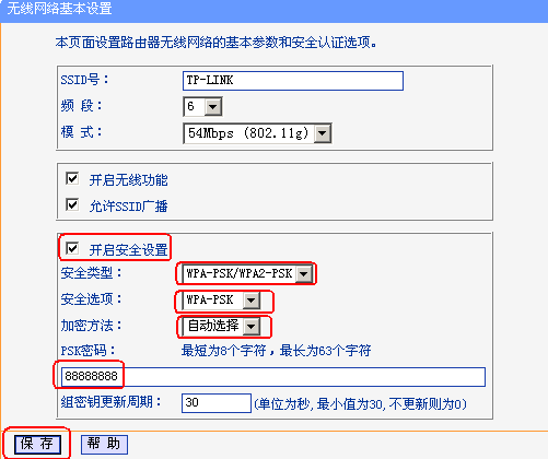 2、在“开启安全设置”前面打钩,“安全类型”选WPA-PSK/WPA2-PSK,安全选项为WPA-PSK(也可以为WPA2-PSK),加密方法为“自动选择”,路由器会在TKIP和AES中自动选择一种作为加密方法,继续填入PSK密钥,本例为88888888,最后保存设置,路由器会提示重新启动,重启后,由于路由器已加密而无线网卡没有加密,因此就连接不上了。