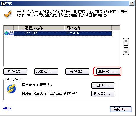 笔记本电脑网卡上的配置:如下图打开Intel PROSet配置程序,点击“配置式”,选择TP-LINK这个已经建好的配置文件名,点击“属性”。
