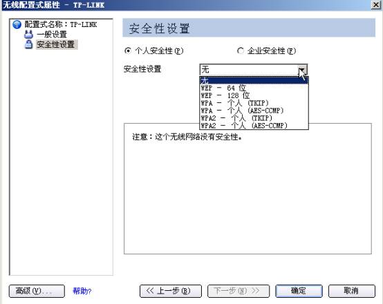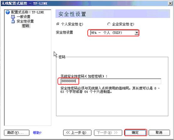 选择WPA-个人(TKIP)或者WPA-个人(AES-CCMP),如果选择WPA2-个人(TKIP)或者WPA2-个人(AES-CCMP)请确认无线路由器那一端支持WPA2并已经配置为WP2 ,TP-LINK“域展”、“域展速展”无线宽带路由器都是支持WPA2的。密码栏就输入刚才WR541G上面输入的88888888。