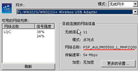 该模式下主要是通过PSP设备和支持PSP功能的无线网卡进行连接,无线网卡再通过有线连接共享来进行游戏,因此前提是你的电脑通过有线方式能够上网。本文以TP-LINK网卡WN322G+连接SONY PSP 2000为例进行说明