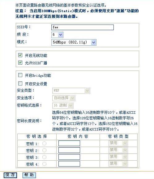 如上图,配置SSID号为fae;频段为6;模式为54M(802.11g);开启无线功能;不勾选开启安全设置。