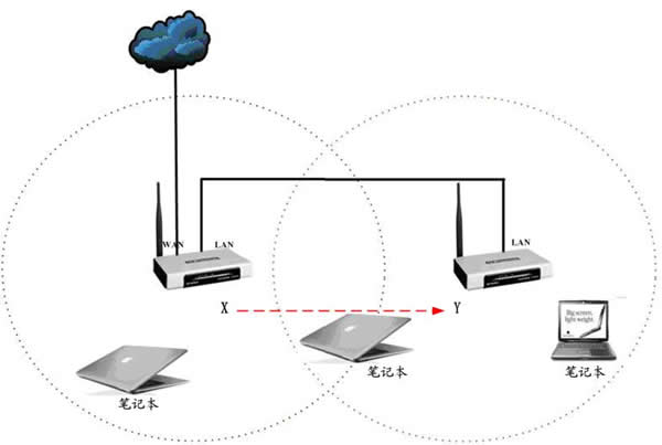 无线客户端用户从X位置移动到Y位置,都能保持网络连接。在使用时,无线网卡能够自动发现附近信号强度最大的AP,并通过这个AP实现对整个网络资源的访问。 无线漫游网络中,无线AP最好采用同品牌同型号同版本的产品。本文中以TL-WR641G+为例。