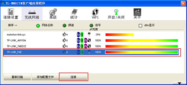 直接连接就是在扫描到的接入点中单击选中要连接的接入点,然后点击连接来接入到接入点(如果接入点不在列表中,可通过单击重新扫描刷新列表)。