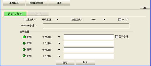 对于认证和加密信息,必须保持和接入点的设置一致,才能保证能连接上接入点以及正常通信。