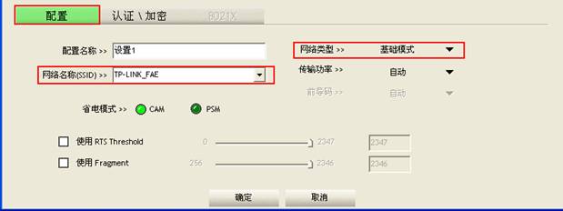 在配置中选择网络类型为基础模式,网络名称(SSID)填写接入点的SSID,其它设置保持默认状态。