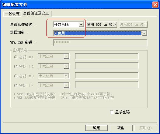 4) 如果您要连接的无线网络是启用安全的无线网络,身份验证模式、数据加密、密钥必须保持和接入点的设置一致,才能保证连接上接入点以及正常通信。