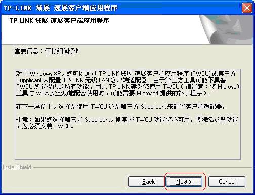 6) 这里提示您使用我司域展 速展客户端应用程序(TWCU)才可以完全的实现网卡的功能,点击Next。