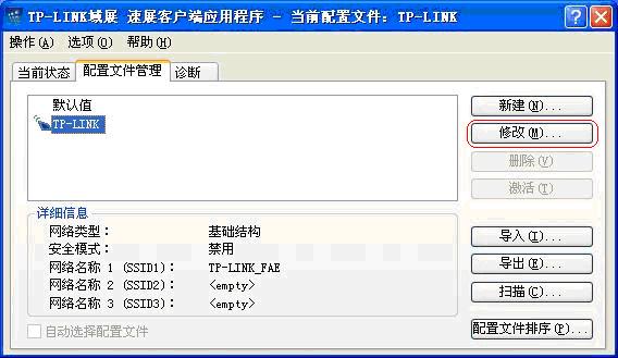 5) 知道前端无线路由器的配置后,需要在无线网卡端进行相应的无线加密设置。此时在配置文件管理中,配置文件名可以自由填写。SSID1需要与我们即将连接的无线信号“TP-LINK_FAE”一致