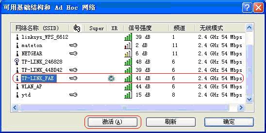 3) 应用程序会扫描到周围的无线信号,单击选中要连接的接入点,然后点击激活(如果接入点不在列表中,可通过单击“刷新”刷新列表)。下面以接入“TP-LINK_FAE”为例进行描述。