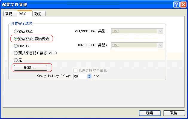 7) 由于前端无线路由器是WPA-PSK加密方式,因此我们在网卡中选择WPA/WPA2密码短语,点击配置按钮后,输入路由器中的PSK密码,点击确定。