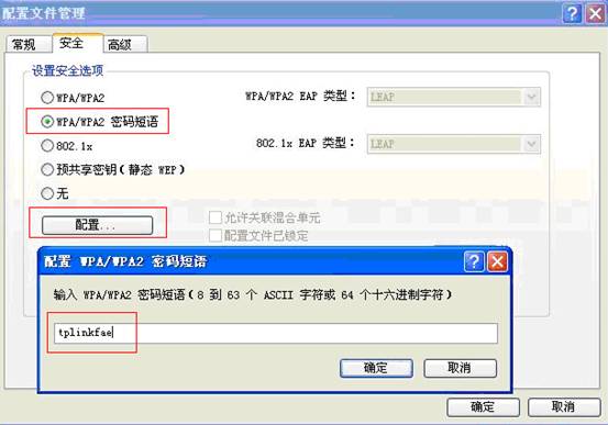 出现“配置WPA/WPA2密码短语”的对话框,这里输入的预共享密钥一定要和路由器里面设置的一样(对照图3),本例中输入tplinkfae即可!