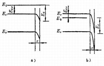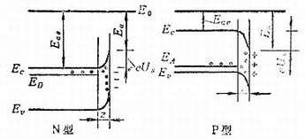 对于P型半导体,情况正好相反。表面能级中能量高于受主能级的电子有的要跃迁到受主能级上,于是半导体表面即产生一个正的空间电荷区,距离表面稍远一点的体内则分布有等量的负电荷,因此表面能带向下弯。特别是P型半导体表面吸附有带正电性的原子(例如铯原子)或N型材料的时候,表面上偶电层正电性在外,能带弯曲就更厉害。能带弯曲的程度也用表面势垒eUs表示。表面能带向下弯,使得体内电子亲和势比能带不发生弯曲时减少一个势垒高度eUs。这样,这种表面能带弯曲对于体内的光电子发射十分有利。