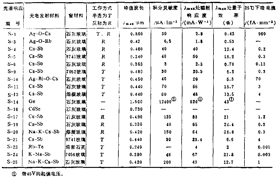 常规光电阴极编号及特性表