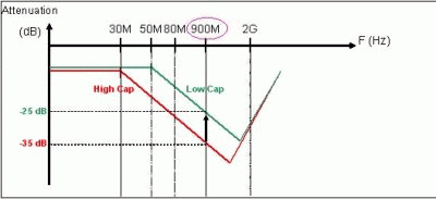 不过设计者知道,在滤波电容值与GSM/CDMA频率上的衰减特性之间存在着无法解决的折衷问题。低电容结构会影响滤波器的高频性能,且目前大多数低电容滤波器都不能在900MHz频率上提供优于-25dB的衰减性能。图2显示了EMI滤波电容对GSM频率衰减的影响。