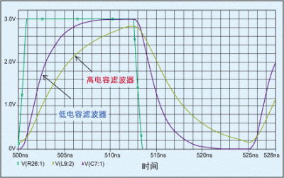 图5显示了工作于40MHz频率上的3V视频信号分别通过高、低电容滤波器的传输情况比较。可以发现,高电容结构所引起的延时是低电容结构的5至6倍。在这种情况下,信号输出电压不能被正确地接收。