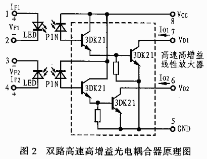 近几年来,国内有关单位投入大量人力物力也研究和开发了各种光电耦合器件。如上海半导体器件八厂、上海无线电十七厂等。而重庆光电技术研究所为了适应市场需要研制出了一种由高速响应发光器件和逻辑输出型光接收放大器组成的厚膜集成双路高速高增益电耦合器。这种光电耦合器的输入端由两只GaAIAs侧面发光管组成,其输出端由两只Si—PIN光电探测器以及两个高速高增益线性放大电路组成。图2所示为其原理电路图,除此之外,重庆光电技术研究所还研制出了高速高压光电耦合器、GG2150I型射频信号光电耦合器、GG2060I型高压脉冲测量光电耦合器、GH1204U型高压光传输光电耦合器以及 GH1201Y型和GOHQ-I型光电耦合器等。
