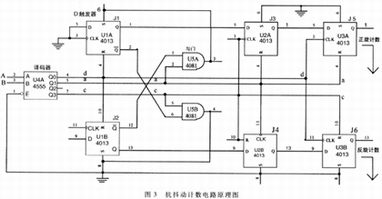图3是抗抖动计数电路原理图。此电路滤除了旋转编码器输出波形的抖动现象。该电路分为四个部分:译码电路U4A;互锁电路U5A、U5B;正旋计数链J1、J3、J5和反旋计数链J2、J4、J6。U4A为二四译码器,U5A、U5B为与门,J1~J6为D触发器。正旋计数链负责对编码器正向旋转的计数,反旋计数链负责对编码器反向旋转的计数。