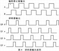 译码器产生d、a、b、c四种不同的状态。在图3中当B=0、A=0时,译码器Q0输出为d状态,d状态为高电平。当B=0、A=1时,译码器Q1输入为a状态,a状态为高电平。当B=1、A=1时,译码器Q2输出为b状态,b状态为高电平。B状态不影响计数和方向确定,在图3电路中没有使用。当B=1、A=0时,译码器Q3输出为c状态,c状态为高电平。