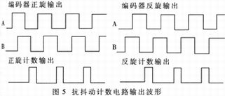 图5为抗抖动计数电路的输出波形。此电路计数频率可达10MHz。A相和B相输入前应予整形,必要时还要进行电隔离。