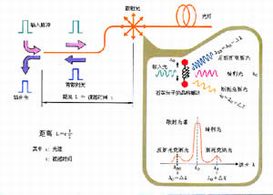分布式光纤温度传感器获取空间温度分布信息的原理是利用光在光纤中传输能够产生后向散射,在光纤中注入一定能量和宽度的激光脉冲,它在光纤中传输的同时不断产生后向散射光波,这些后向散射光波的状态受到所在光纤散射点的温度影响而有所改变,将散射回来的光波经波分复用、检测解调后,送入信号处理系统便可将温度信号实时显示出来,并且由光纤中光波的传输速度和背向光回波的时间对这些信息定位。其原理和结构框图如图4-1和图4-2所示。