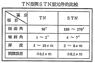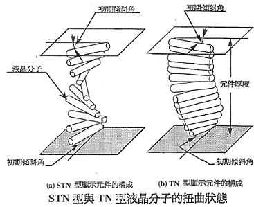 angle)增加,此外,STN显示组件所使用的nematic液晶中加入微量胆石醇(cholesteric)液晶使向列型液晶可以旋转角度为80~270度,约为TN