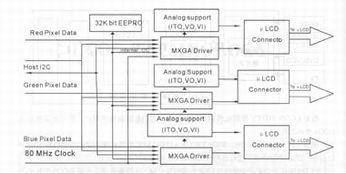 驱动电路由两个IC芯片组成,一个芯片用于RG信号转换成平行输出信号,RGB各8位信号,频率为65MHZ,该3组信号分别送入三个驱动CHIP