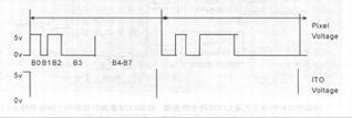 LCOS显示控制电路的工作原理可描述如下。LCOS显示的灰度等级由一个按时间变化的脉冲周期的调制信号提供,该信号的电压由所显示的灰度等级来决定。其精度信息由复杂的计算所确定。图示为一个加列单个像素上的电压波形的例子。在设备上提供像素的正半周期8bit数字电压为1010b转换成电压大约为偏度值的67%,负半周期8bit数字电压为01010b。ITO电压提供用于液晶的DC平衡,以防已经物理特性的变坏。