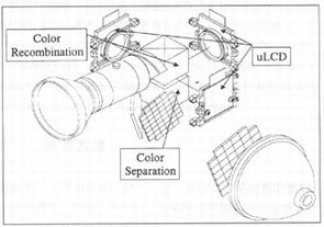 LCOS技术与相应的光学系统结合可以用于正投影或背投影系统。在投影显示系统中使用LCOS技术与其它技术相比具有高分辨率、低成本·图象亮率更大、重量更轻等特点。