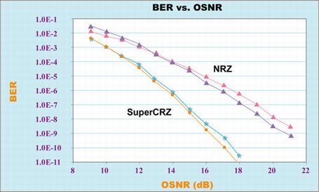 图1为10Gbps NRZ与RZ格式的OSNR-背靠背原始BER特性曲线的比较,RZ码型由SuperCRZ收发一体模块产生。