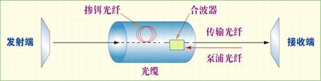 具体的实现方法如下:将高功率(0.5W)连续运转激光从光纤跨段的输出端注入传输光纤,该泵浦光的传输方向与信号光传输方向相反。泵浦激光器的波长比信号光短约100nm。高功率光场泵浦光纤中的组分物质,产生虚激发态;电子从这些虚激发态向基态跃迁,从而实现光信号的增益,光放大方式与EDFA类似。