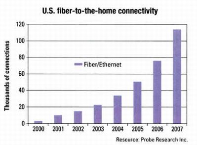 Council)在最近所召开的会议预测,2003年美国和加拿大会有31.5万家庭进入光纤到户的新纪元,而根据该研究的计算值也预测,2004年此一数字会迅速增长到100万家庭。根据这份报告和其它市场分析家的结论可以得知,独立的电信运营商将会率先采纳光纤标准。