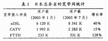 日本是全球FTTH发展最好的国家,截至2003年6月30日,用户为45.8万,并且有加速发展的趋势.表1是日本总务省对包括FTTH及各种宽带接入网的统计数据,按照发展趋势,到2005年以后,光纤接入将超过数字用户线(DSL).