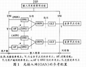 光纤在接入网中也占有传输媒介的主导位置,特别是当带宽成为业务瓶颈的时候. 光纤接入是指局端与用户之间以光纤作为传输媒体.在光接入网(OAN)中若光配线网(ODN)全部由无源器件组成,不包括任何有源节点,则这种光接入网就是PON.根据技术体制,则可分为PDH光接入技术、SDH光接入技术、ATM光接入技术和以太网光接入技术等.图1是OAN的参考配置.光线路终端(OLT)为ODN提供网络接口并连至一个或多个ODN.ODN为OLT和光网络单元(ONU)提供传输手段.ONU为OAN提供用户侧接口并和ODN相连.