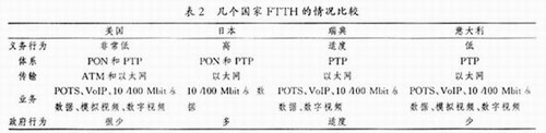 各种光纤接入技术都可能用作FTTH的解决方案,表2是目前几个国家FTTH的应用情况比较.光纤接入技术包括有源光网络和无源光网络.有源光网络技术和产品有初期的SLIC(Subscriber Line Interface Circuit)和后来的DLC(Digital Loop Carrier)、IDLC(Integrated Digital Loop Carrier)等,国际电信联盟提出的基于PDH的灵活复用和基于SDH的灵活复用也属于有源光接入技术.现在也有把波分复用(WDM)技术用于光接入网的.实际上,包括目前应用较广泛的点到点(PTP)的MC,都属于有源光纤接入.