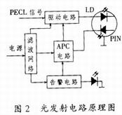 光发射电路是将数据信号转变为光信号送入光纤进行传输.它主要包括信号的调制、静态工作点调节和自动功率控制(APC)等子电路.图2是它的工作 原理图.