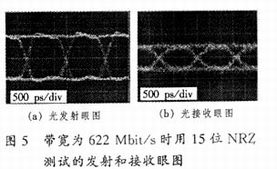 利用TEK公司的误码测试仪TEKGB700,产生7位、15位或21位的伪随机码(NRZ)进行性能测试.在NRZ为215-1 PRBS,误码率(BER)=1×10-12下模块 的灵敏度为-15 dB.图5为带宽622 Mbit/s时用15位NRZ测试的发射和接收眼图.