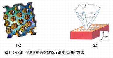 光子晶体(photonic crystal)是E.Yablonovich于1987年提出的新概念和新材料,从晶体结构来说,晶体内部的原子是周期性有序排列的,正是这种周期势场的存在,使得运动的电子受到周期势场的布拉格散射,从而形成能带结构,带与带之间可能存在带隙。电子波的能量如果落在这种带隙中,就无法继续传播。其实,不论是电磁波,还是其它波如光波等,只要受到周期性调制,都有能带结构,也都有可能出现带隙。而能量落在带隙中的波同样不能传播。在1991年,Yablonovich制作了第一块光子晶体,如图1所示。他所采用的方法是在折射率为3.6的材料上用机械方法钻出许多直径为1mm的孔,并呈周期性分布。这种材料从此被称为“Yablonovich”,它可阻止里面的微波从任何方向传播出去。