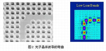 首先,光子晶体波导具有优良的弯曲效应。在一般的光纤波导中,当波导拐弯时,全内反射条件不再有效.因此会漏掉部分光波能量,使传输效率降低。而光子晶体弯曲波导中,所利用的是不同方向缺陷模共振匹配原理。原则上只要达到模式匹配,不管拐多大弯,都能达到很高的传输效率。图2为光子晶体波导的低损耗传输示意图。弯曲效应在全光集成系统中很有应用价值。