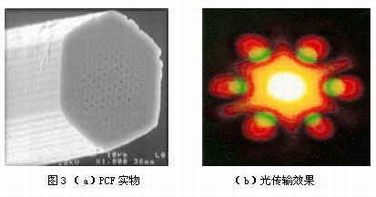 其次,光子晶体光纤较传统光纤具有显著的优势。光子晶体带隙特性不但保证了能量传输中的基本无损失,而且不会出现延迟等影响数据传输率的现象。另外,光子晶体光纤还具有极宽的传输频带,可全波段传输。如图3是目前英国斯温顿Bath大学的实验性光子晶体光纤实物图和传输效果图。
