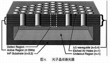 此外,光子晶体还可用于制造各种性能优良的光通讯器件,如光子晶体激光器。在传统的激光器中存在着一些问题。例如,激光器的发射波长的变化使传输损耗发生变化,这对波分复用系统是十分不利的,而且随着激光器功率的增加,激光器的线宽趋于饱和,并开始重新展宽,这对于相干光纤通信,特别是PDM调制十分不利。激光器的辐射角虽然比LED已经大大减小,但仍然不理想,这也导致了激光器的耦合效率不高,只能达到30%-50%。而在激光器中引入一带有缺陷的光子晶体,使缺陷态形成的波导与出射方向成一样的角度,这样,自发辐射的能量就几乎可以全部用来发射激光,这就大大降低了激光器的阈值。光子晶体激光器,如图4所示。目前,人们正在进行着无阈值激光器的研究。