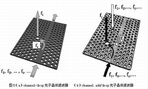 OADM是光通信中的一个重要器件,而滤波器又是其中的重要元件,主要实现channel add/drop功能。图5(a)是一种光子晶体channel drop滤波器示意图。这种结构是通过在一块具有二维的光子晶体平板中引入单点缺陷来实现的。频率为fi的光可以被分离出来,转移到其它的波导中,而其它频率的光将不会受任何影响,从理论上来说,这种分离方法是不会给光造成任何损失的。最近人们又成功的实现了channel add的功能,如图5(b)所示。