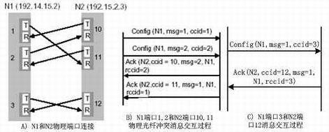 ① 邻居发现:自动邻居发现过程允许直连的相邻网元设备确认彼此的身份端口ID和对所连接的远端接口进行认证。如果邻居发现过程在网元设备中没有被实现,那么邻居和远程端口ID必须被手工配置到相应的设备信令实体中。用于自动邻居发现过程的消息交换在IPCC(IP Control Channel)中进行,而IPCC的实现方式有“带内或光纤内”(承载信令的通道被嵌在挟带数据的光链路中,一般在SONET/SDH的线路或段数据通信通道DCC中传送)和“带外或光纤外”(专用信令链路与承载数据的光链路分离,如外部IP传送网和专用双向SONET/SDH连接净荷中传送,其组帧方式为IP over PPP over SONET/SDH)两种。如图3所示,N1和N2网元设备通过三对双向光纤相连,图中T表示激光发送器,R表示光检测接收器。N1端口3发送包含自己IP地址标志和端口ID(被称为控制通道ID:CCID)的配置消息给N2的端口12,N2接收到后保存起来并复制,发送确认消息(含有自身以及刚刚从邻居那里学习到的IP地址标志和端口ID)给N1,从而完成邻居之间的端口映射关系。自动邻居发现过程避免了因手工配置邻居和端口连接信息带来的潜在错误,而且提供了一种自动检测物理线路冲突的方法。图中N1端口1,2和N2端口10,11的物理连接关系就是一个物理线路错误案例,(N1,1)发送配置消息给(N2,11),同样(N1,2)→(N2,10);而(N1,1)从(N2,10)接收到的确认消息中没有看见自己的信息,发现的却是(N1,2)的信息,(N1,2)←(N2,11)也同样如此。因此立即就可以发现N1和N2端口之间物理线路配置有问题。