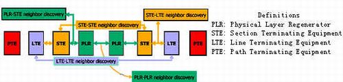 ③ 同层和错层邻居发现:此过程属于邻居发现过程的扩充部分,由于ASON是在ASTN和OTN的基础上发展的,因此ASON的传送平面趋向于一种分层结构,在不同传输技术(密集波分复用DWDM/时分复用TDM/SDH/SONET)共存的情况下,以SDH/SONET网络的分层结构为例(如图5所示),目的在于清晰的描绘复用结构和提供高性能的监控/故障管理功能(如警告指示信令和远程检测指示信令被插入到每一层中,用于每层明确定位网络传送信令的中断位置)。正因为传送网分层结构导致了光网络自动邻居检测的复杂性,图6描述了基于SDH/SONET/DWDM传输系统的智能光网络中同层和错层(即不同层之间)邻居发现过程。当邻居设备共享复用结构的共同级别时,自动邻居发现选项由复用结构该层的功能决定的。如果链路的两端运行在复用层次的不同级别,本质上来说这是一种单向邻居发现过程。