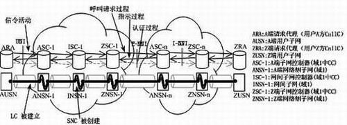 图7描述了基于DCM跨于全光网的呼叫建立过程,为了支持交换连接服务,呼叫请求通过A端用户请求代理ARA发送“呼叫建立请求”消息给主叫方呼叫控制器而被初始化,呼叫请求指定了与用户请求呼叫关联的信息(包括与服务相关的服务水平协议SLA,安全性方面和策略相关的信息等等)。而对于软永久连接服务的支持是通过管理平面来处理的,运营商在网元设备系统和网络管理系统中预先设置管理参数来要求连接控制器CC建立连接来支持呼叫请求,这和ATM中的PVC以及电话网中的电路出租管理类似。用于呼叫建立的资源主要有子网节点SNP,子网节点缓冲池SNPP,链路连接LC等等。为了建立端到端的跨于全光网的呼叫连接,必须涉及到呼叫请求过程,连接请求过程,以及不同类型资源连接的创建过程。由于ASON重叠网络模型的多域结构导致了整个连接通路的建立由链路连接LC和子网连接SNC分别创建和相互串联构成。