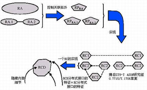 分布式的控制平面是智能光网络的最大特色,很多国际标准化组织致力于这项工作的研究。ASON由ITU-T提出、研究并进行标准化,它秉承了ITU的风格,如图2所示ASON标准化采用自顶向下的方式,从一套完整清晰的需求开始ASTN(G.8070),到高层结构设计ASON(G.8080),最后是单元结构(一批规范)。任何满足单元结构需求的协议都可能成为实现ASON控制平面的选择。主要有:用于数据通信网DCN方面的G.7712;用于信令方面的G.7713(基于PNNI/Q.2931的G.7713.1、基于RSVP-TE的G.7713.2和基于CR-LDP的G.7713.3);用于邻居发现和服务发现的G.7714(主要针对SDH/SONET/DWDM设备的资源发现G.7714.1);用于路由协议的G.7715;用于链路资源管理方面的G.7716等等建议草案系列。