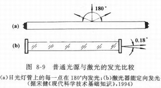 ——普通光源(太阳、白炽灯或荧光灯)向四面八方发光,而激光的发光方向可以限制在小于几个毫弧度立体角内(图8-9),这就使得在照射方向上的照度提高千万倍。激光准直、导向和测距就是利用方向性好这一特性。