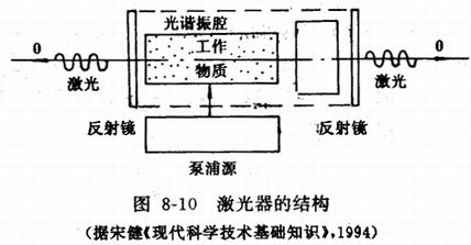 ——我们通常所说的激光器,就是使光源中的粒子受到激励而产生受激辐射跃迁,实现粒子数反转,然后通过受激辐射而产生光的放大的装置。激光器虽然多种多样,但使命都是通过激励和受激辐射而获得激光。因此基本组成通常均由激活介质(即被激励后能产生粒子数反转的工作物质)、激励装置(即能使激活介质发生粒子数反转的能源,泵浦源)和光谐振腔(即能使光束在其中反复振荡和被多次放大的两块平面反射镜)等三个部分组成(图8-2)。